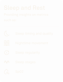 • Green and infrared LEDs alternate to measure heart rate and heart rate variability 24/7 and respiration rate during sleep